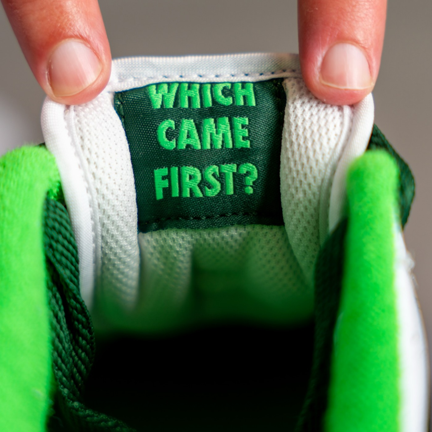 除了各处彰显俄勒冈鸭的元素,鞋舌内侧还有 Which Came First? 标签。