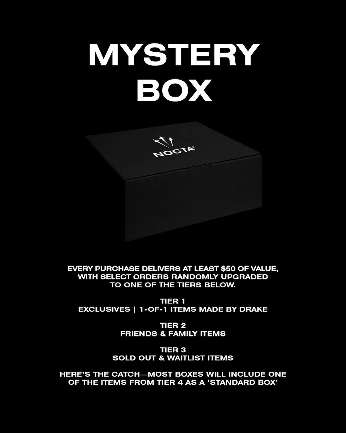 最近 NOCTA 也赶上了这股热潮,官网上线了一项售价 $50 美元的神秘盲盒活动,还有机会获得到 NOCTA 从未发售过的产品。