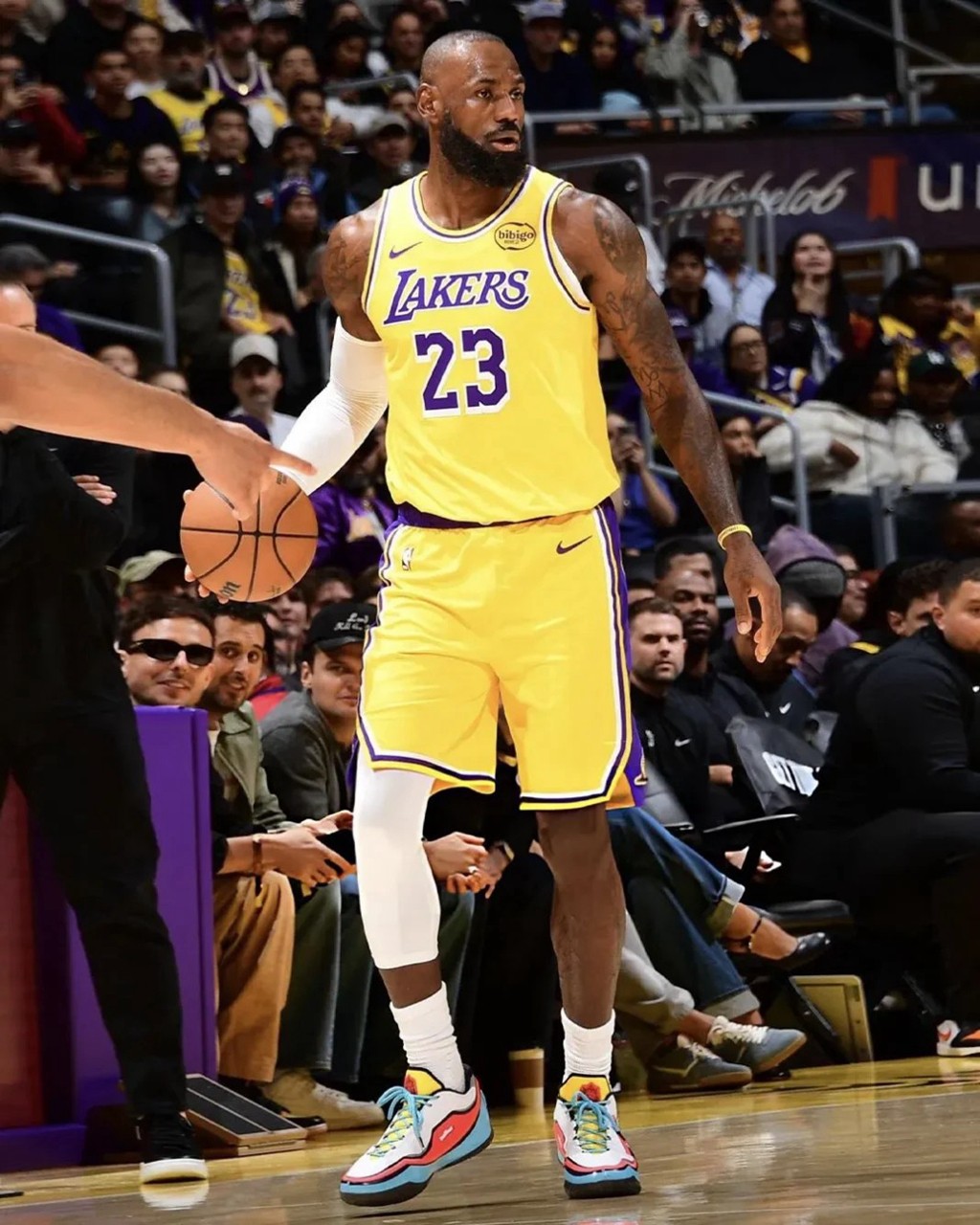 在最近湖人对阵太阳的比赛中,詹姆斯上脚了此前从未见过的新配色 Nike LeBron 23。