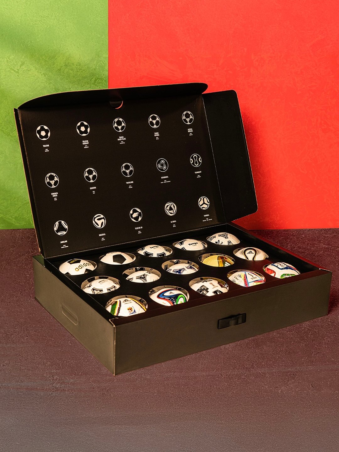 这款套装采用礼盒包装,涵盖历届 15 款经典比赛用球的 1 号迷你版足球,再现那些深入人心的绝妙设计与图腾花纹。