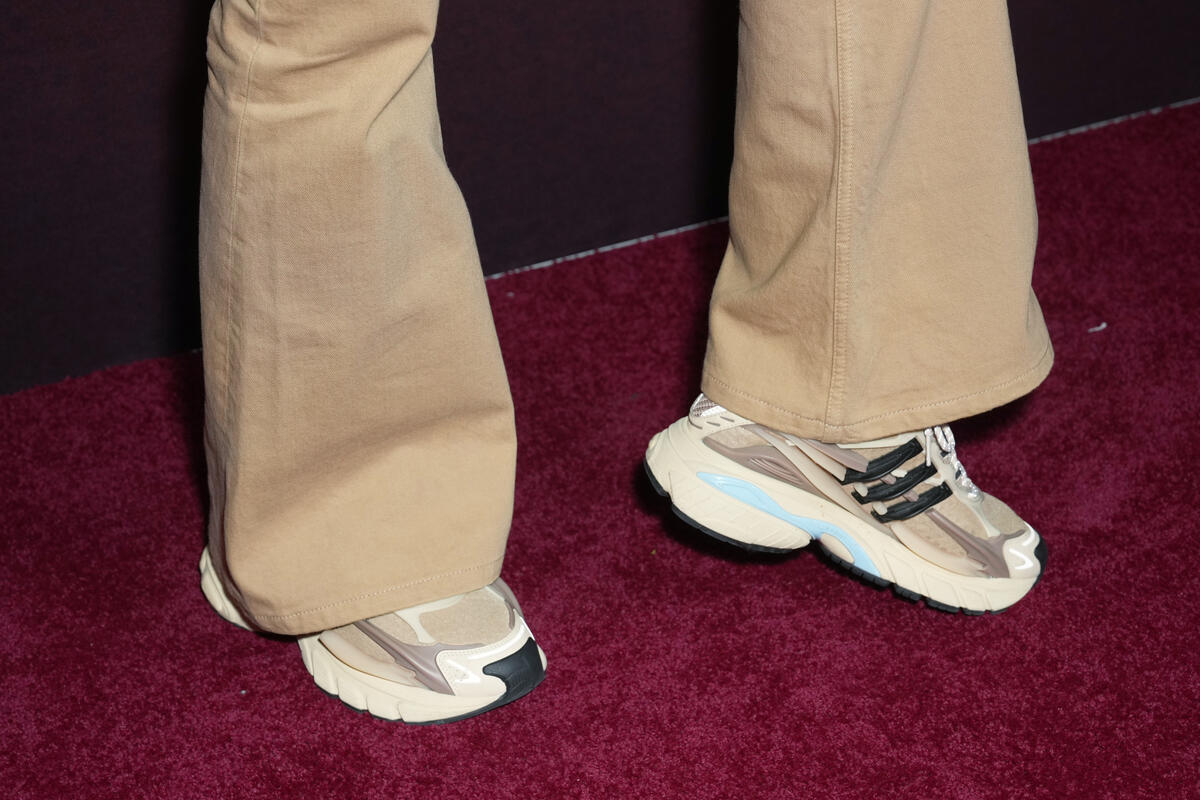 在镜头前刻意展示了这双鞋的细节,咖色为主点缀蓝色细节,颜值绝对在线。