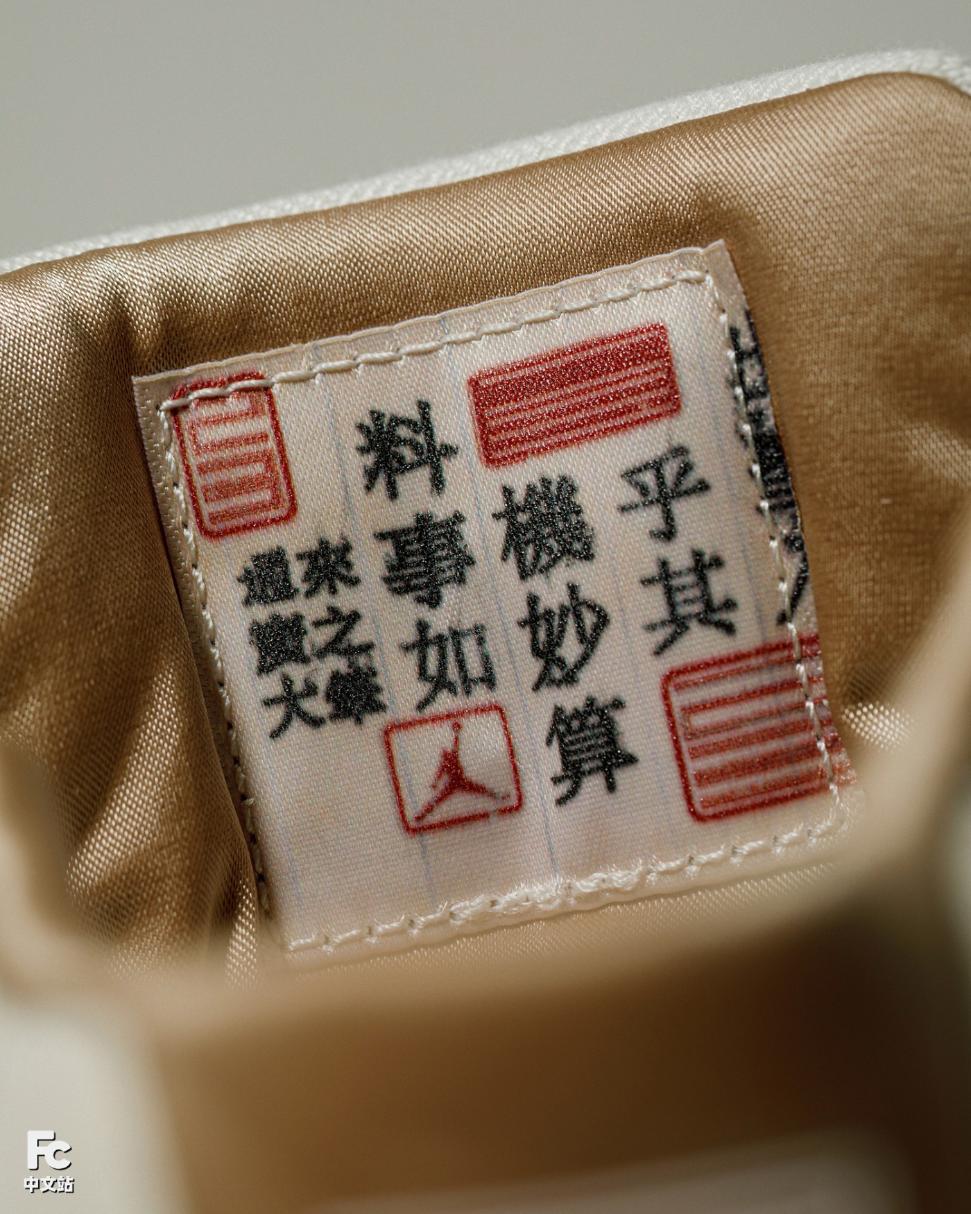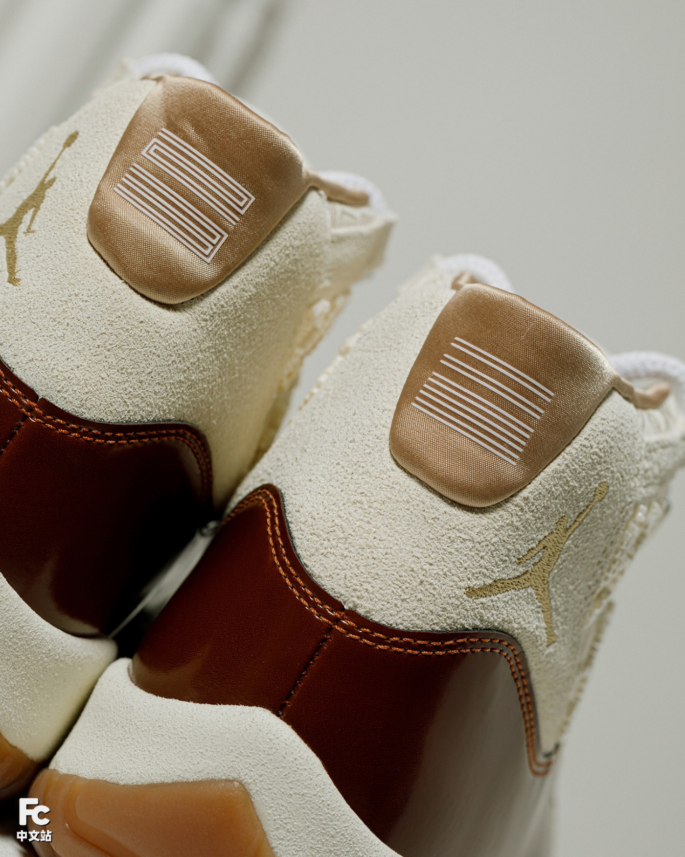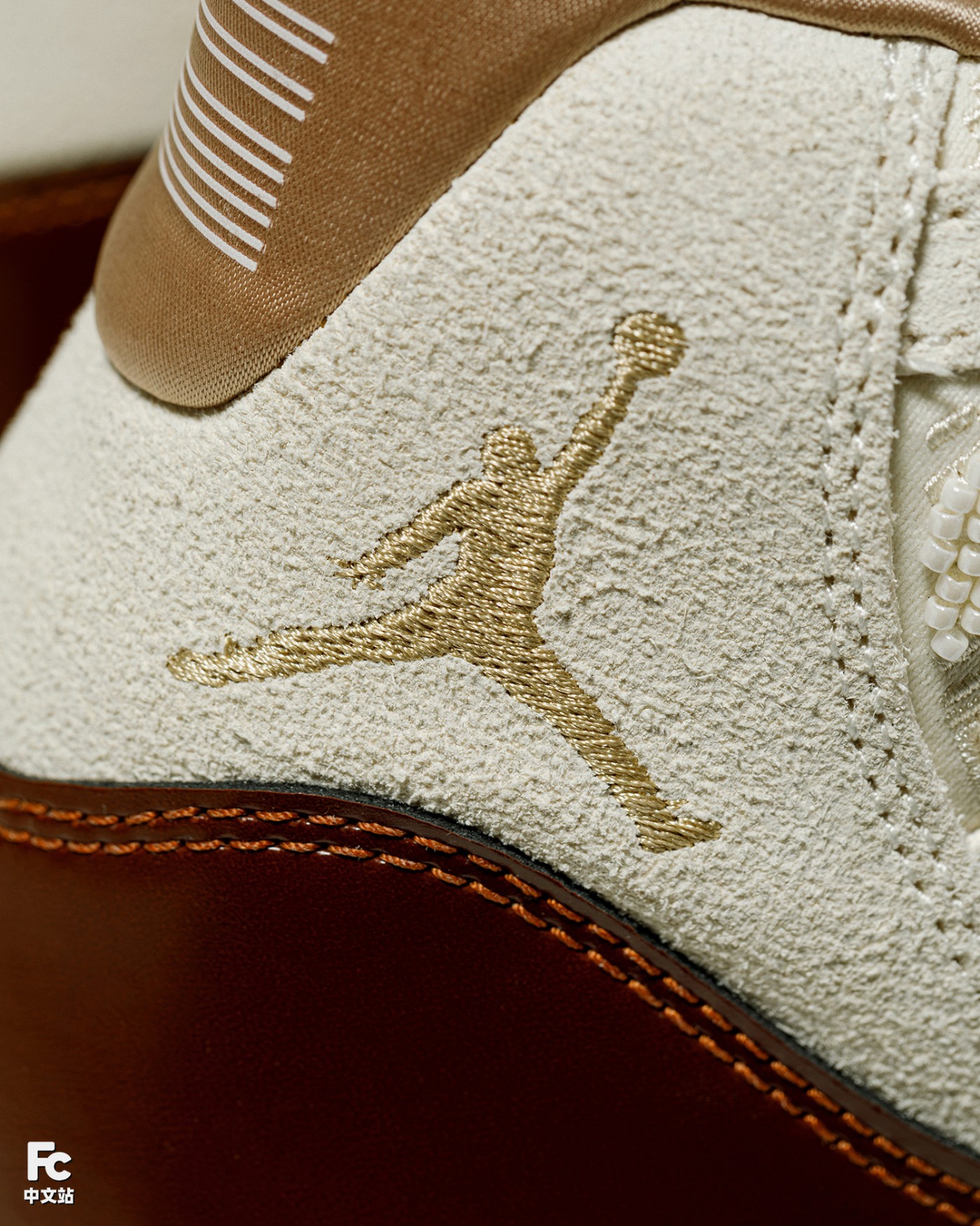 棕色漆皮材质搭配翻毛皮鞋身,香槟金的 Jumpman Logo,加之丝绸般内衬 + 东方元素的串珠设计,细节呈现相当精致。
