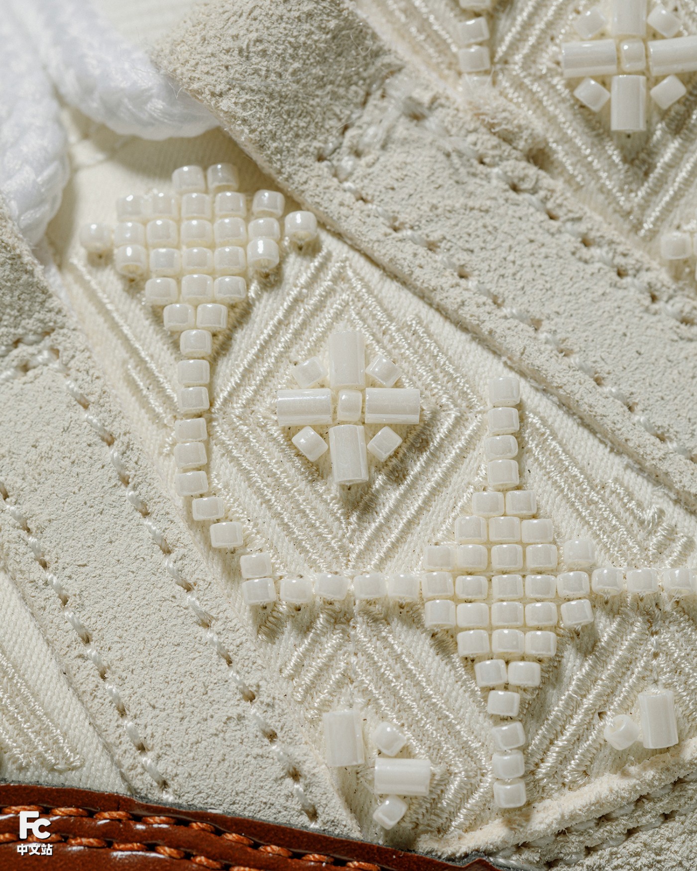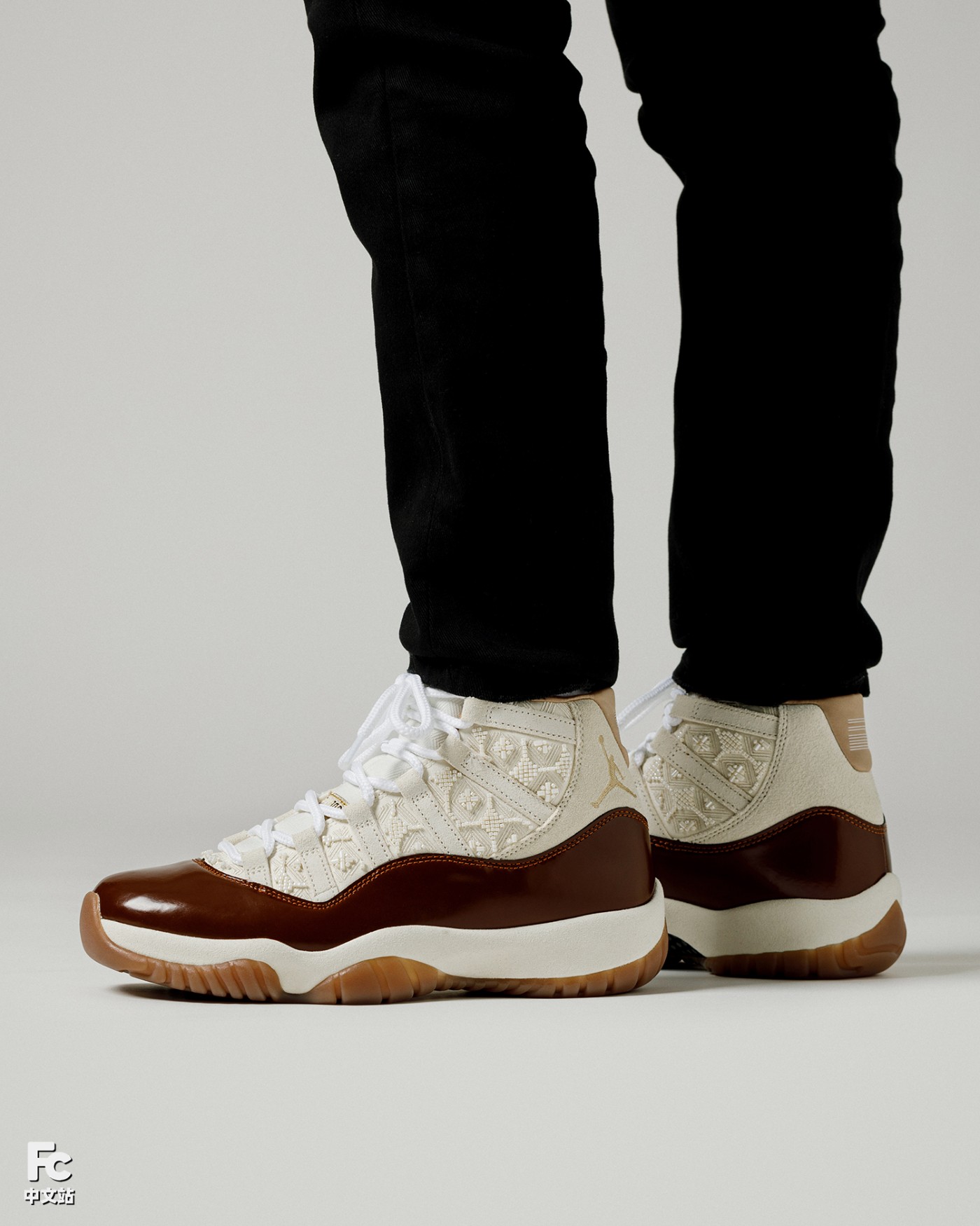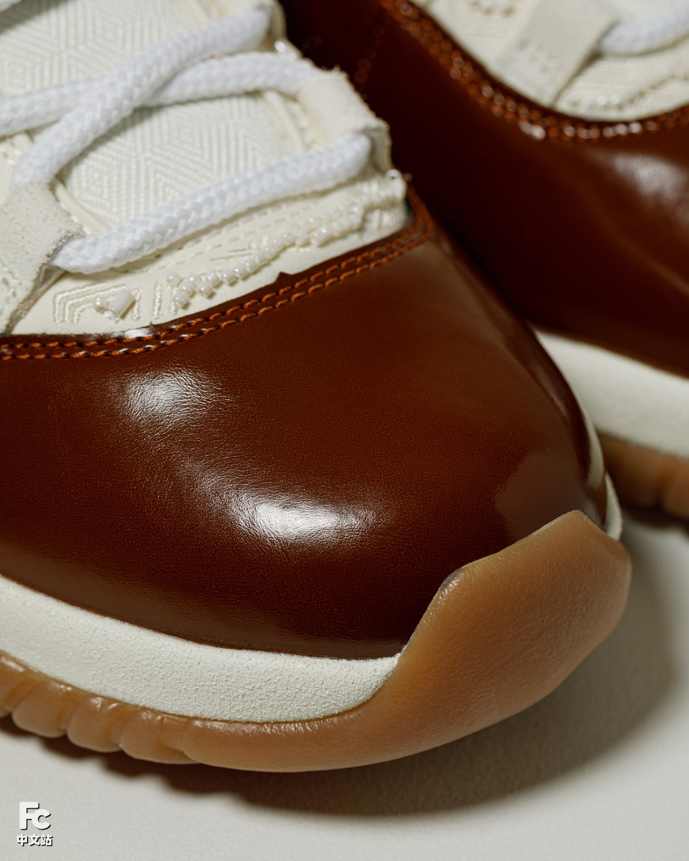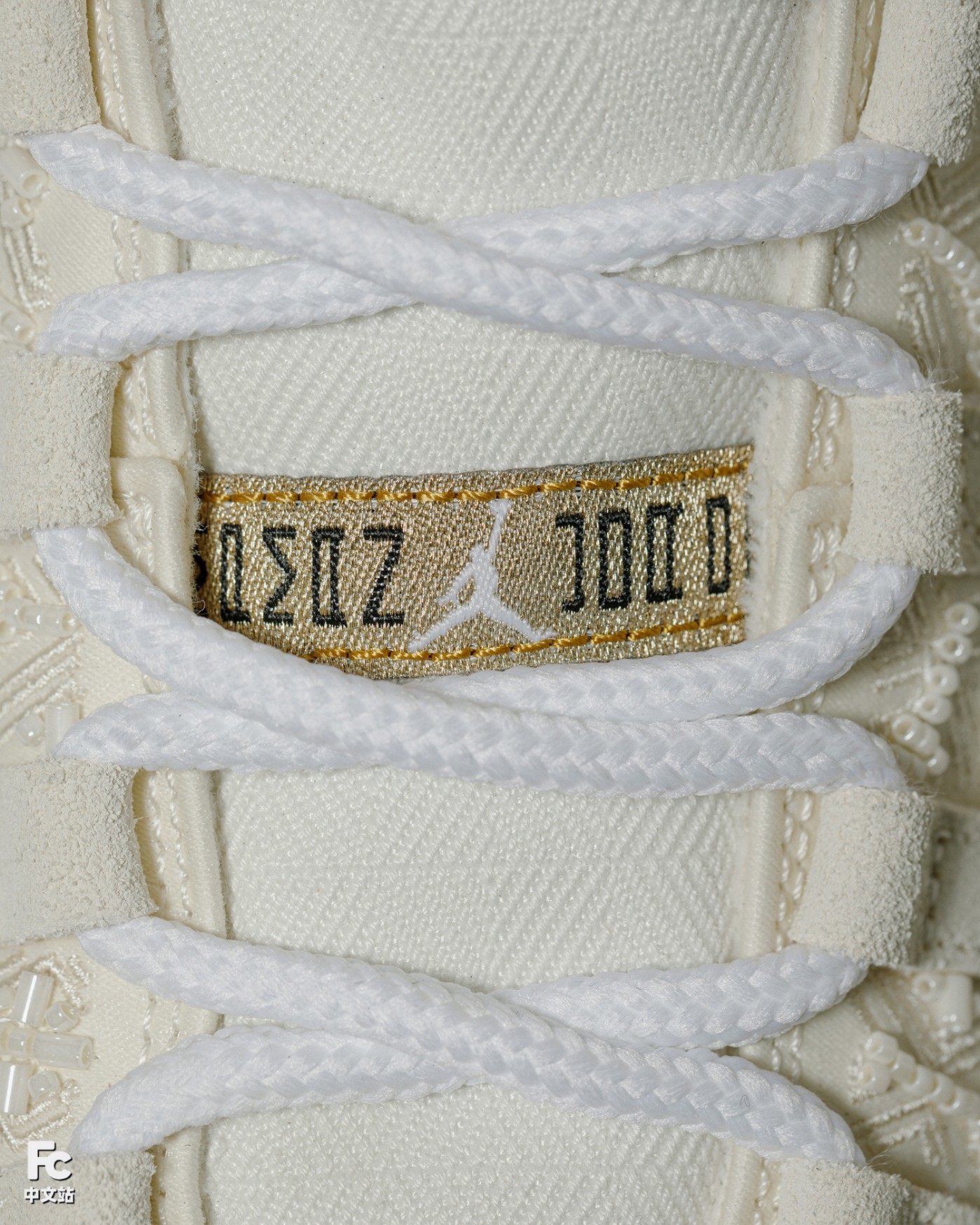 棕色漆皮材质搭配翻毛皮鞋身,香槟金的 Jumpman Logo,加之丝绸般内衬 + 东方元素的串珠设计,细节呈现相当精致。