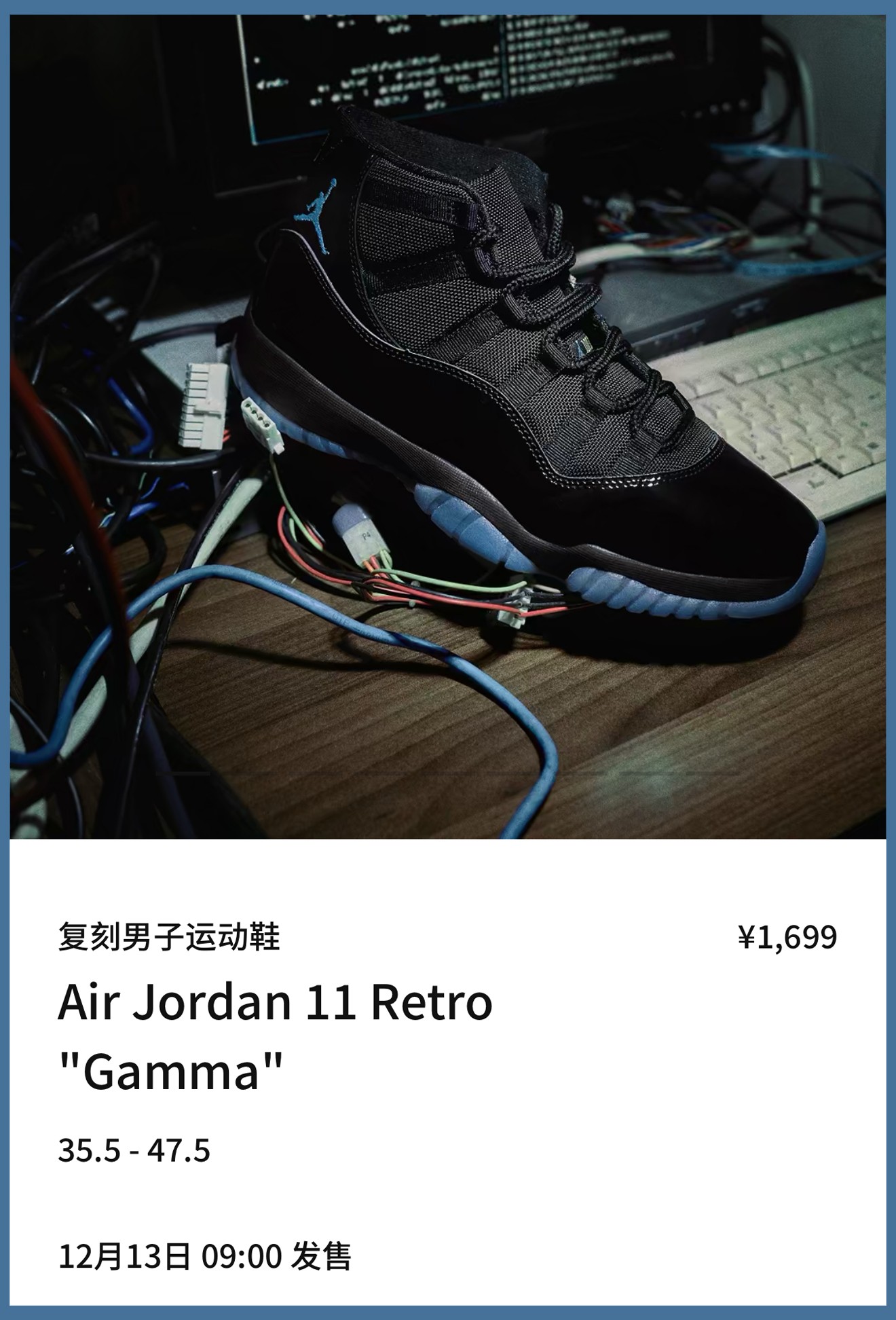 目前伽马蓝 Air Jordan 11 “Gamma”已在国区 SNKRS 上架预告,确定将于 12 月 13 日也就是明早 9 点,携全家族尺码登场,成人款官方定价 ¥1699 RMB。