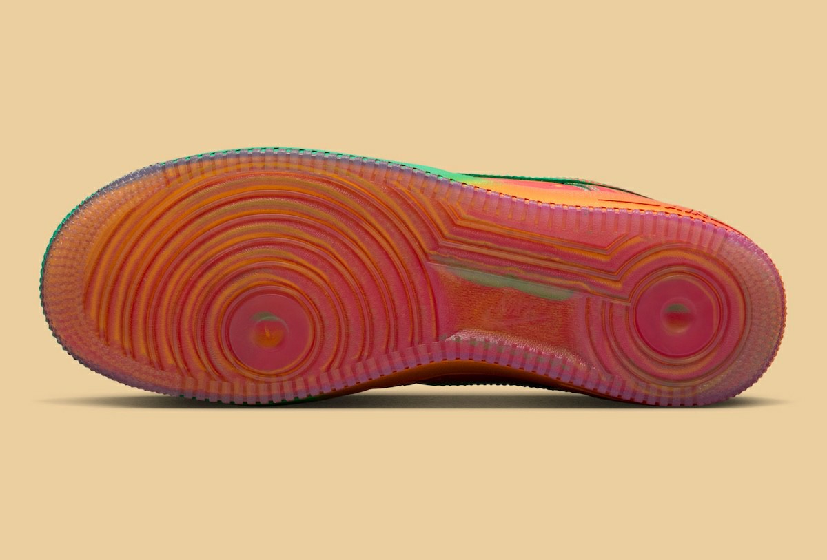 鞋款保留了经典的 Air Force 1 Low 皮质鞋面,但配色使用却令人眼前一亮。鞋头采用绿色,鞋跟则逐渐过渡到热情似火的红色和黄色,还以为是热成像温变材料。