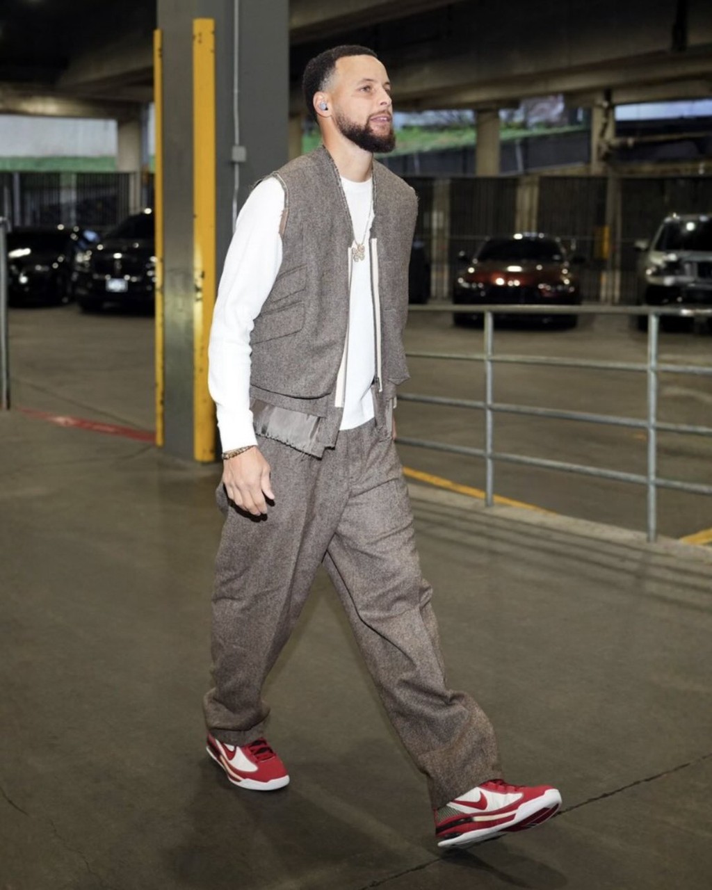 首先是对阵森林狼,那自然绕不开加内特,于是库里选择了 Nike Garnett 3 这双经典老鞋作为入场穿搭上脚。