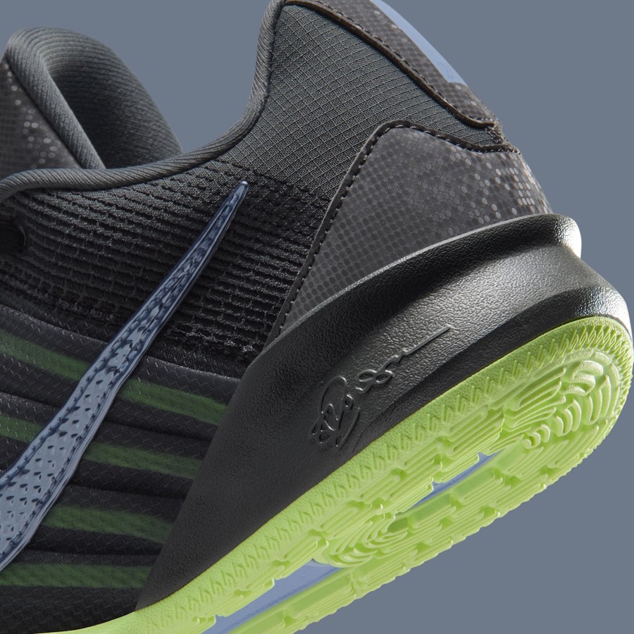 整体鞋身采用深灰色结合荧光绿构建,细看鞋舌及后跟部位还点缀有类似波点迷彩的反光装饰,加之鞋身两侧 Swoosh 的炫彩立体刻画,颜值同样不俗。