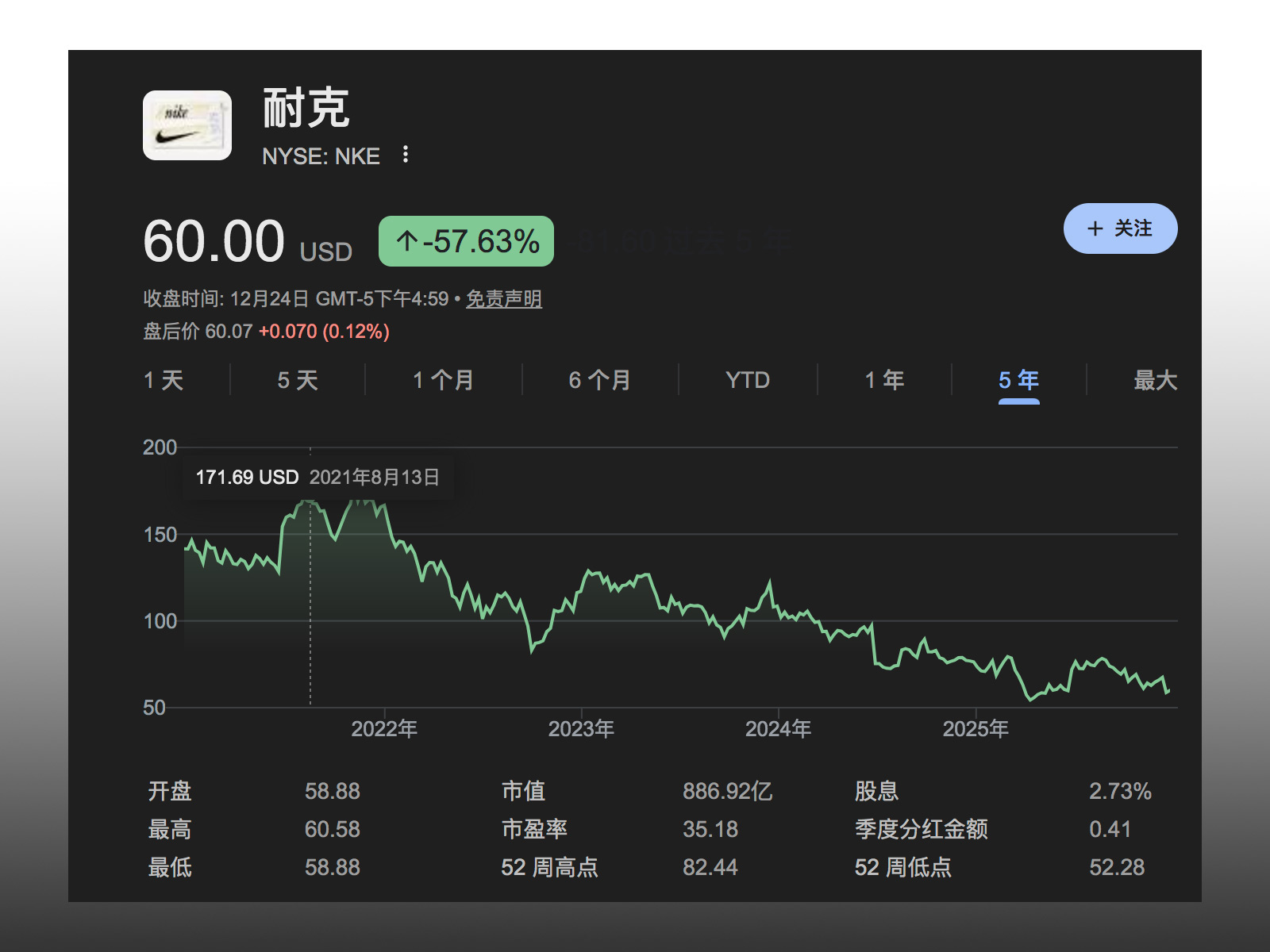 Nike 的股价目前在 60 美元上下,正处 5 年来的低点,而 2021 年公司股价曾经一度攀升至 170 美元的高点。