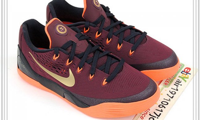 为了纪念 Kobe 在宾夕法尼亚州劳尔梅里恩高中的辉煌时刻而打造,这款Nike Kobe 9 EM Deep Garnet 采用酒红色 EM 鞋面搭配黑色中底和橙色大底,鞋舌上的 1996 字样则再现了 Kobe 带领高中队夺得