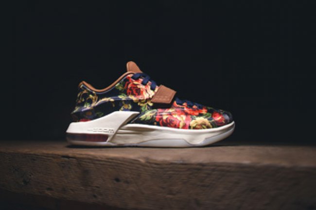 Floral 花卉配色再现 KD 系列,此款KD7 EXT Floral QS 采用绸缎鞋面呈现玫瑰图案,搭配棕色皮革魔术贴,旨在表现杜兰特的 MVP 成长之路。 货号:726438-400 发售日期:2 月 12 日