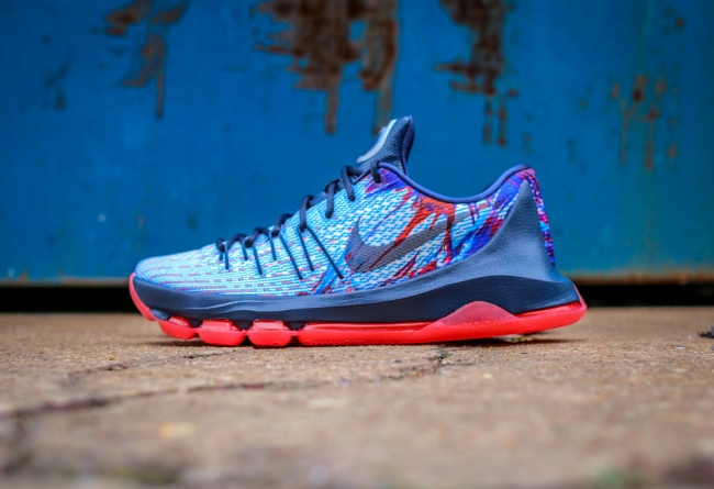 尚未正式官方发布的 Nike KD8 加入了 Nike Basketball 在今年的美国独立日系列。眼前这款 KD8 美国独立日配色在 Mesh 鞋面上以红蓝泼墨装扮营造出美国国家配色氛围,搭配藏青色中底和鞋舌