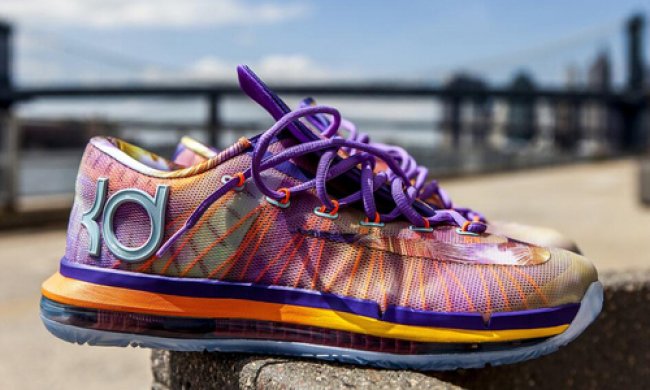 看过实物后段局部预览之后,为EYBL青年精英篮球联赛特别准备的Nike KD 6 Elite PE终于呈现完整实物。鞋款选用紫色搭配橙色,网面织物鞋身以渐变效果装饰,内衬附有类似花卉纹理点缀。
