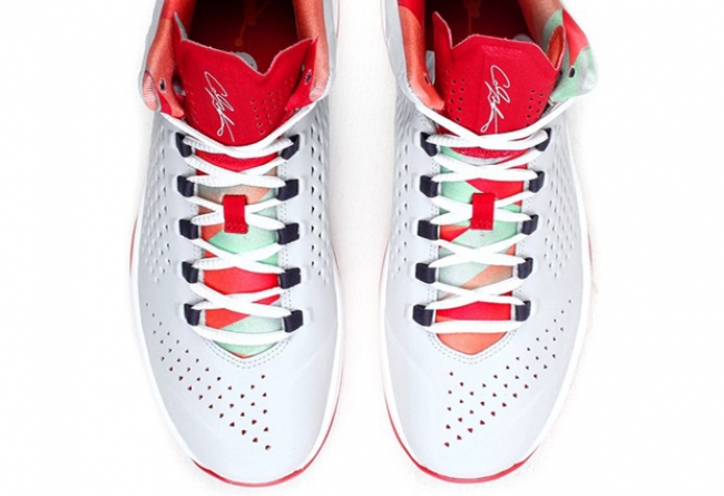Hare 兔八哥配色登陆甜瓜战靴,在 Jordan Melo M11 上以经典的Hare 装扮呈现。灰色鞋面搭配白色中底,经典的 Hare 多彩几何图案在鞋舌和内衬展现,搭配红色的鞋舌和外底,反差点缀加上