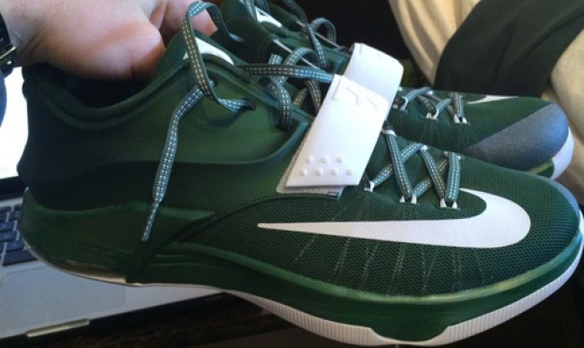 Nike已经重视起球员出售球队PE装备的行为,因此近日ebay出现KD 7密歇根州立大学PE也令人颇感意外,毕竟现在赛季都还未结束。此双PE以暗绿色作为主色调搭配白色细节,色调简洁却不失