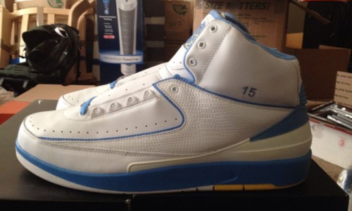 有 eBay 卖家出售为 Carmelo Anthony 量身打造的掘金主场色Air Jordan 2 PE。白蓝搭配的掘金配色,鞋帮上有 15 和 Melo 字样刺绣。