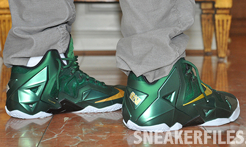 作为LeBron James的母校,SVSM自然会有专属LeBron鞋款,而且以绿金色为主旋律的PE鞋款双双不拉,LeBron 11同样如此。继实物曝光后,网上曝出LeBron 11 SVSM PE的上脚效果照。带有金属感的Hype