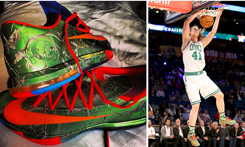在今天上午结束的2014新秀赛上,凯尔特人队新秀凯利-奥利尼克穿着了一双非常特别的Nike KD VIBig Game Hunter定制鞋款。绿色鞋身呈现出独特的金属光泽,辅以橙色细节及蓝色大底,令球鞋