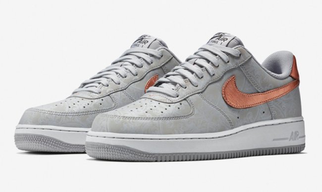 经典鞋型 Nike Air Force 1 Low 发售新款配色系列,以灰色作为主色调,鞋面上呈现出巴洛克风格图纹,Swoosh 和后跟以金属铜色呈现,凸显奢华的点缀效果,货号为 718152-004,已经登录 Nike