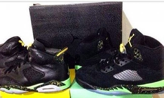 在巴西世界杯即将开幕之时,网络上又疑似曝光了一款巴西主题的Air Jordan 5。鞋款与之前曝光的Air Jordan 6 配色灵感相同,均使用黑色为主色调,搭配荧光色细节及水晶大底。不同的是,