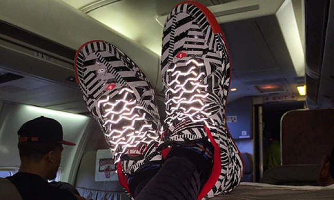 今日迈阿密热火队飞赴圣安东尼奥准备即将开打的NBA2013-14赛季总决赛第一场,在飞机上倍感无聊的闪电侠Dwyane Wade和自己的双脚也开始了自拍。一双全新配色的李宁韦德之道2返场,极为