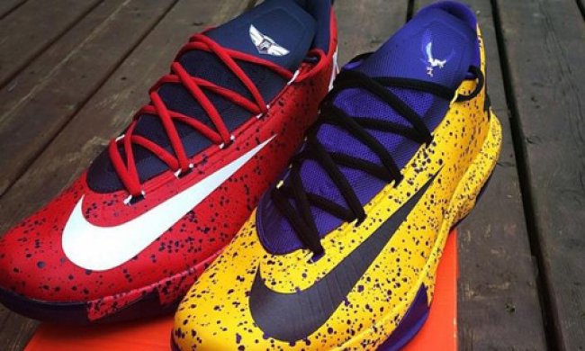 Nike KD 6已然成为不少校园球队的PE鞋款模板,比如眼前这两双。芬德兰高中版本为Henderson定做,蒙特沃德学院别注则为Montverde打造。鞋款分别以红色搭配海军蓝点缀白色、黄色搭配紫色