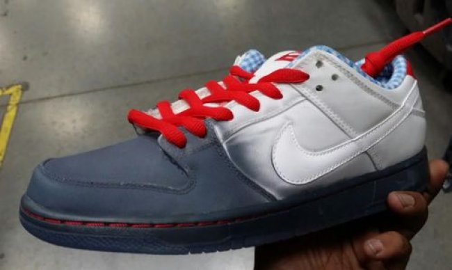 一款疑似以《绿野仙踪》中桃乐茜作为灵感设计的Nike SB Dunk Low曝出实物照,白灰色渐变鞋身搭配蓝白格纹内衬,风格如同桃乐茜的连衣裙一般,红色点缀则像她的红色皮鞋一样醒目。暂