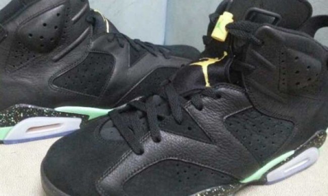 带来更多关于毒液配色的Air Jordan 6 Venom Green 实物图片。整体采用了黑色的鞋面,点缀荧光色和薄荷绿细节,货号为688446-020,将于 2014 年夏秋季上市发售。
