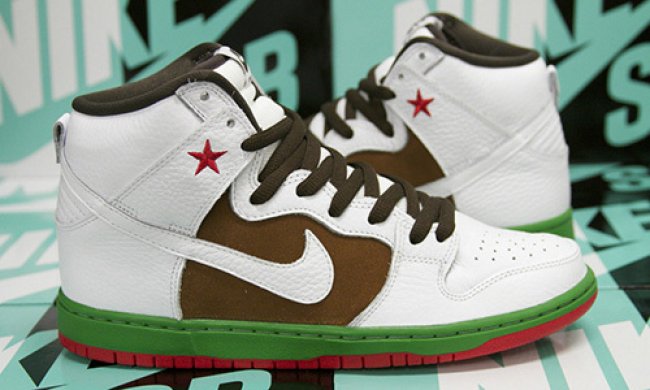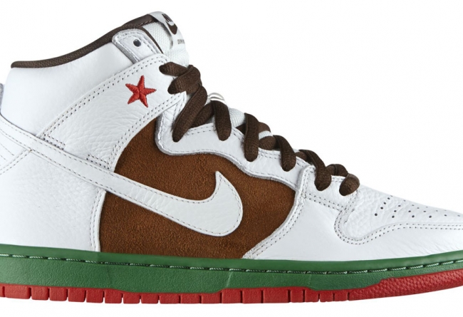 还记得2004年,Nike SB推出的那双Nike SB Dunk Cali吗?时隔十年之后,Nike SB决定将该配色灵感移植到Nike SB Dunk High之上。白色皮革鞋身、绿红鞋底、棕色翻毛细节、脚踝处标志性的红星细节让