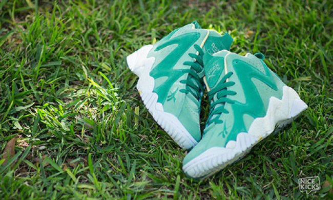 为庆祝复活节的来临,Reebok特地使用复活节标志性薄荷绿色调打造了一双Reebok Kamikaze II Mid复活节。薄荷绿麂皮鞋身,搭配白色中底,荧光黄内衬及中底泼墨点缀鞋款之中,令Reebok Kami