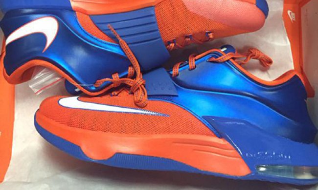 Nike KD 7 再曝新配色,鞋身整体由醒目的橙色与蓝色拼接而成,仅在鞋面上辅以简洁的白色Swoosh。据悉,这款色彩靓丽的Nike KD 7 是为佛罗里达大学短吻鳄队的校队成员们准备的全新PE,醒