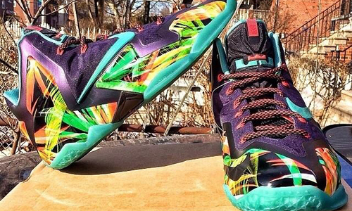 Nike Basketball为LeBron重新打造了一款国王荣耀PE。渐变紫色鞋身配以水蓝色以及红色细节,原本装饰于内衬的花卉图案此番高调表现于Hyperposite材质。