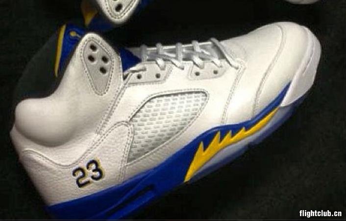 来自 kicksordie 的 AIR JORDAN 5 蓝尼配色上脚实拍图。白色鞋面,蓝黄搭配的火焰喷射图案,数字23刺绣,蓝色水晶大底,你期待吗?
