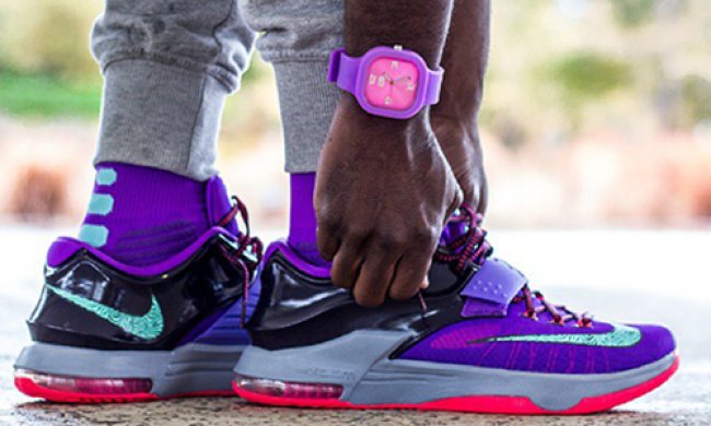 这款色彩靓丽的Nike KD 7 以闪电每年击中纽约帝国大厦25次作为设计灵感,紫色Hyperfuse鞋面拼接黑紫色Hyperposite后跟,令鞋身呈现出纽约的夜色。红色外底与薄荷绿细节点缀其中。这款N