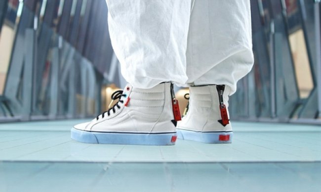 VANS 旗下高端产品线 VANS Vault 携手知名鞋店 Sole Classics 打造联名鞋款,Sole Classics x Vans Vault Sk8-Hi Reissue Zip LX A-8SC 以第一个登上月球的宇航员阿姆斯特朗为灵感来源,以白色尼龙鞋面呈现