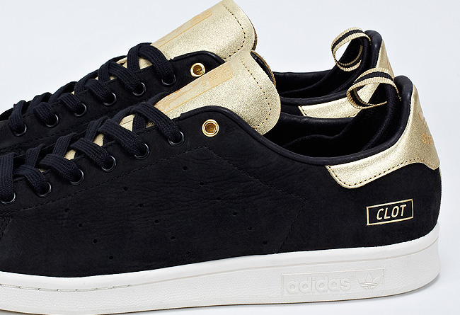 由CLOT与adidas 共同打造的联名Stan Smith 鞋款预计将于2月15日在各指定店铺上架,黑色麂皮鞋身搭配白色中底,辅以金色鞋舌、后跟等细节,令鞋款整体极具质感。