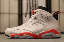 继续为大家带来更多关于 2014 年复刻款Air Jordan 6 "Infrared"的实物图片。 这次的复刻版本采用白色的皮质鞋面,搭配激光红的中底,大底则采用了和 Air Jordan 5 一样的蓝色水晶底。 货号