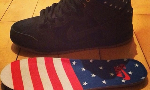 早前已有效果图曝光的独立日别注Nike SB Dunk High如今正式曝光实物照,虽然照片并不清晰,但依旧能够看到暗色调鞋身搭配鞋领部分的星星点缀,鞋垫则印有星条旗图案以凸显独立日主