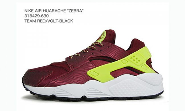 近来价格居高不下的Nike Air Huarache 推出全新Team Red Zebra配色,酒红色主色调鞋身搭配荧光色细节与TPU射出,鞋面上的斑马纹路暗纹令鞋款凸显别致。白色中底的加入,则让整体配色和谐