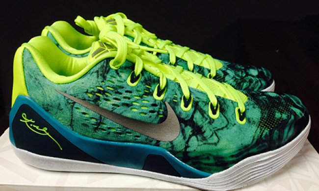 眼前这款清新十足的Nike Kobe 9 EM是为迎接西方传统节日复活节而特别打造的复活节配色。绿色工程网面鞋身辅以黑色不规则花纹装饰,搭配白色大底及荧光色内衬,令鞋款清新十足不失