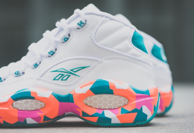 这款曾由Allen Iverson亲着曝光的Reebok Question Mid White Noise即将上市,这款全新配色的 Reebok Question Mid采用白色鞋身搭配薄荷绿色调鞋头与后跟麂皮装饰,橙、粉色调装饰于中底组成极具特色