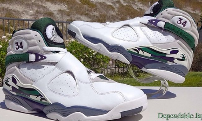 球鞋收藏家DependableJay再度为我们呈上自己的收藏,眼前这款Air Jordan 8 PE是为雄鹿队时期的Ray Allen特别订做,制作于2003年,尺码US14,鞋款以白色为主配以雄鹿队的深绿色以及紫色细节,