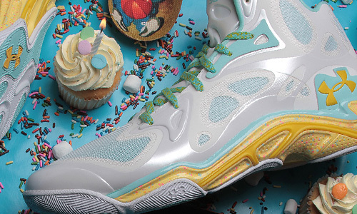 为庆祝Stephen Curry的26岁生日,Under Armour特意为其打造了一款别致的Anatomix Spawn 生日PE。鞋款以儿时的纸杯蛋糕为设计灵感,形同奶油般的白色鞋身搭配薄荷绿细节,黄色中底辅以糖霜状