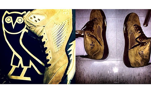 眼前这双以黑金色调打造的Air Jordan 5疑似是为Drake特别打造的,亮眼的金色鞋身搭配黑色细节及大底,左右脚内衬分别印有OVO字样与OVO的猫头鹰Logo。