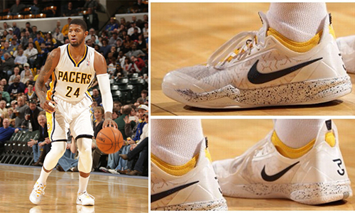 在昨日主场迎战老鹰的比赛中,Paul George上脚了一双全新配色的Nike Zoom Crusader PE。白色鞋面搭配白黑泼墨中底,黄色内衬及黑色Swoosh点缀其中。值得一提的是,这双鞋后跟印有一个全新