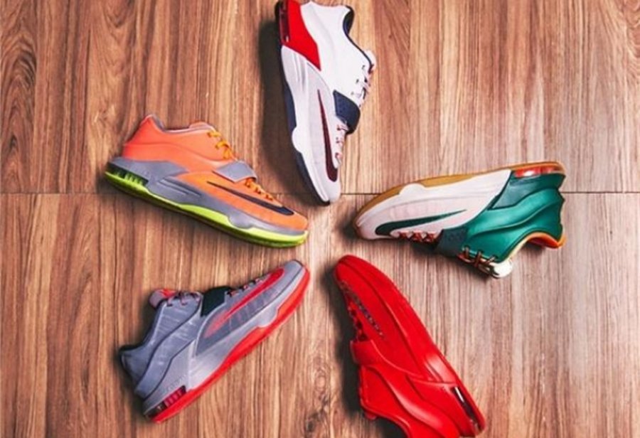 凯文杜兰特 (Kevin Durant) 手持 5 款不同配色 KD7 作为 What The KD 系列最新成员,KD7 What The 将 18 款 KD 战靴的经典元素融合,依然延续了夸张的不对称拼接设计,将于 6 月 20 日登陆大中华区