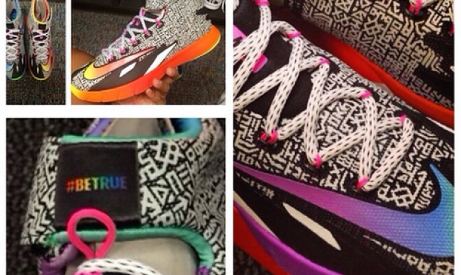 Nike于本月正式发布了全新2014年#BETRUE系列,不过近日部分WNBA球员收到了来自Nike Basketball的新装备,一款非市售但属于#BETRUE系列的Nike Zoom HyperRev。黑色鞋身附上白色图腾纹理,左鞋暖色
