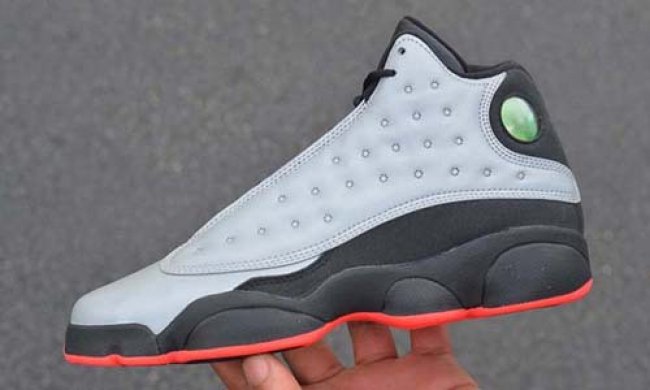 Air Jordan 13 Infrared 23 配色曝光已久,究竟这款使用3M元素与射线红元素打造的全新鞋款实物如何呢,送让一组全新实物图让我们一起来了解下吧!银灰色反光鞋面搭配黑色中底,,仅用射