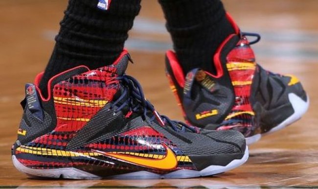 詹皇赛场上脚 LeBron 12 PE 骑士队新配色