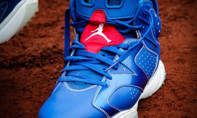 在对阵纽约大都会队的比赛前,洛杉矶道奇队内野手Juan Uribe亲着曝光了一款全新配色的Air Jordan 6棒球鞋PE。鞋款以道奇队的蓝色作为色调主旋律,细节点缀红色并配以白色鞋底。
