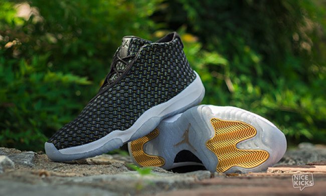 这款Jordan Future 经典赛PE 配色设计与首发的夜光配色类似,黑色编制鞋面搭配水晶大底。不同的是,黑色鞋面上加入了金线装饰,水晶大底内也加入了金粉细节和金色装饰,令鞋款变得